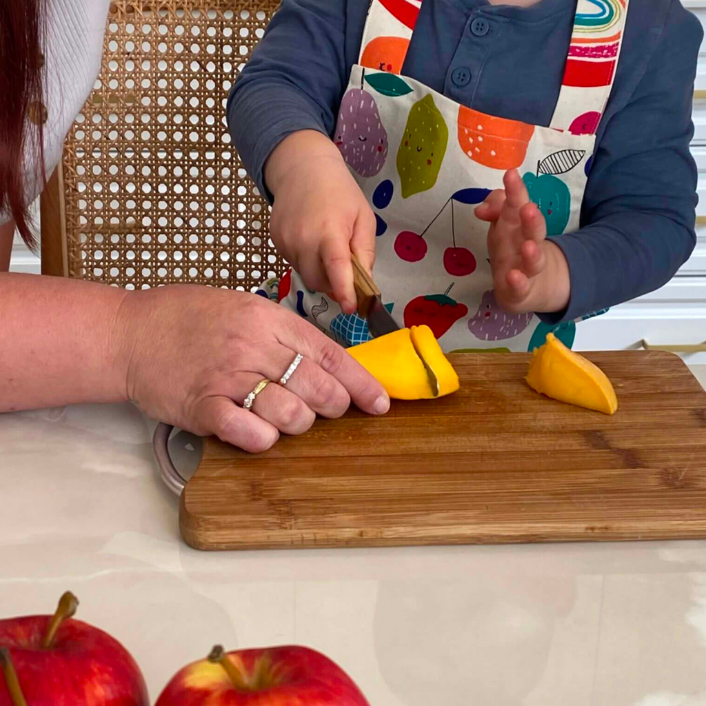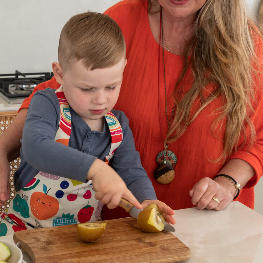 Let them chop their own fruit & vegetable snacks and encourage them to help with family mealtime preparation and know their fingers are perfectly safe!