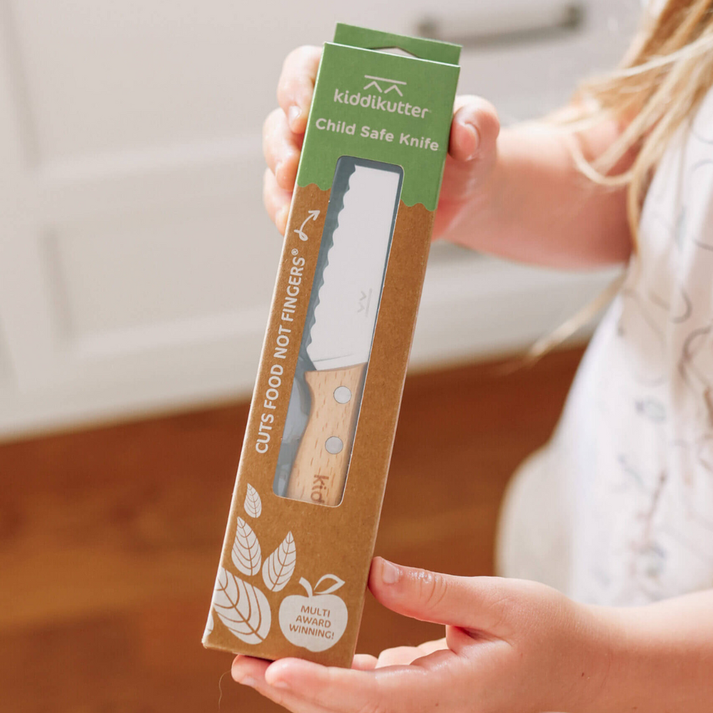 KiddiKutter's new & improved design in a brand new, grown-up Beechwood look! Designed for kids 3+ it now comes with a much wider blade, making it easier to cut everything (except fingers!).
