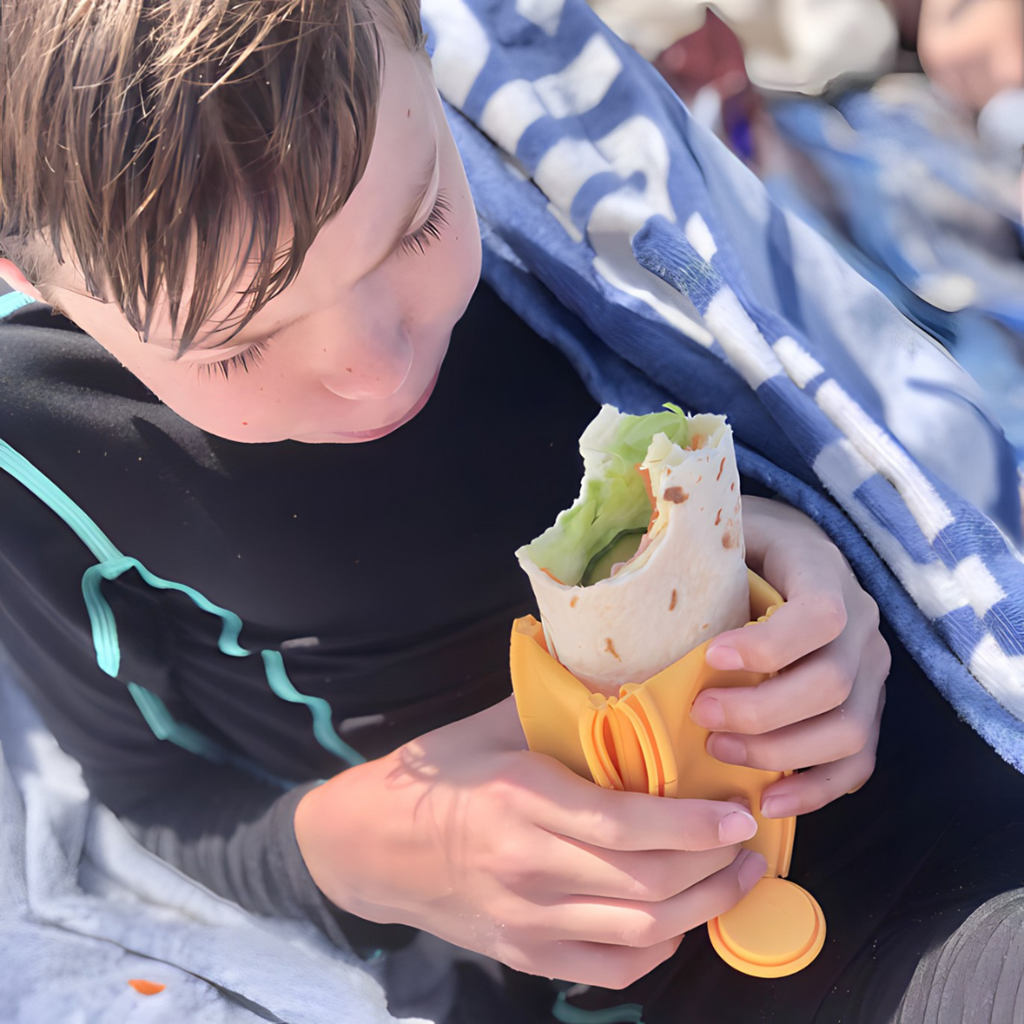 Made from silicone, it works just like a banana – pull the top tabs down to the first fold line and start eating. When you need to reveal more of your wrap, peel down the sides a little further, or if you’ve had enough just seal it back up and save for later.