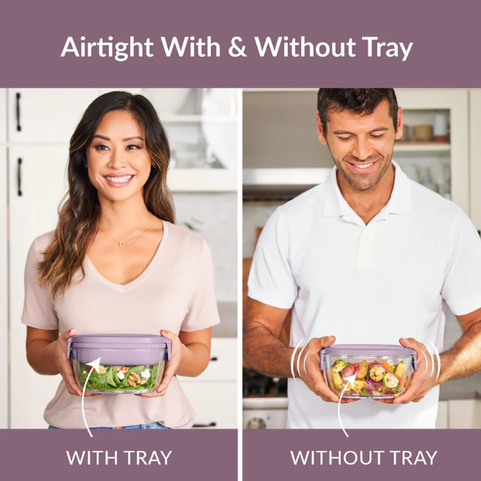 Suitable for both hot or cold dishes, this generously sized 7.6 cup glass bowl is easy, convenient and the perfect solution for transport pre-prepped mess-free meals. Especially great for keeping salad toppings fresh, dry and separated, the removable bento-style tray has four compartment spaces for a variety of easy foods. The unique silicone seal around the lid and locking clips prevent leaking (when using with or without the tray), and can easily hold a hearty helping of greens, pasta, or fruit – making it the perfect lunch salad container for adults. All the components of Bentgo Glass stack conveniently inside the large salad bowl for easy portability while a reusable fork stores under the lid for a complete all-in-one meal.