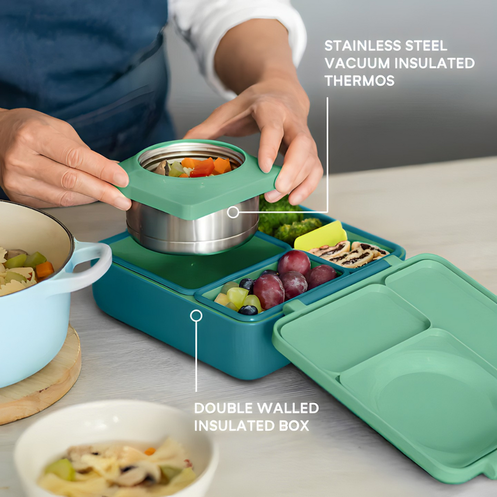 The OmieBox uses two types of insulation to ensure your food is always kept at the optimum temperature. Air insulation, vacuum insulation as well as an airtight seal which minimizes heat transfer and keeps food fresh and tasty. The thermos (which is held in place inside the lunchbox thanks to the securing insert), can be used for either hot OR cold foods and is completely removable. When removed, it leaves a great space for a large sandwich, wrap, breadroll or salad.