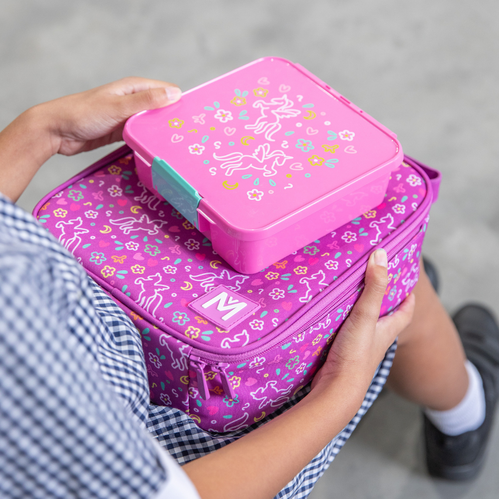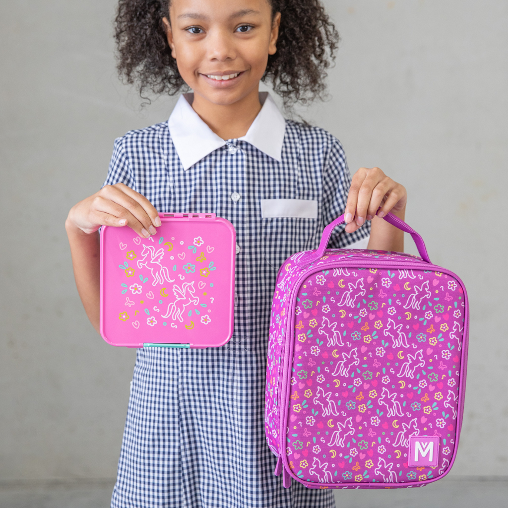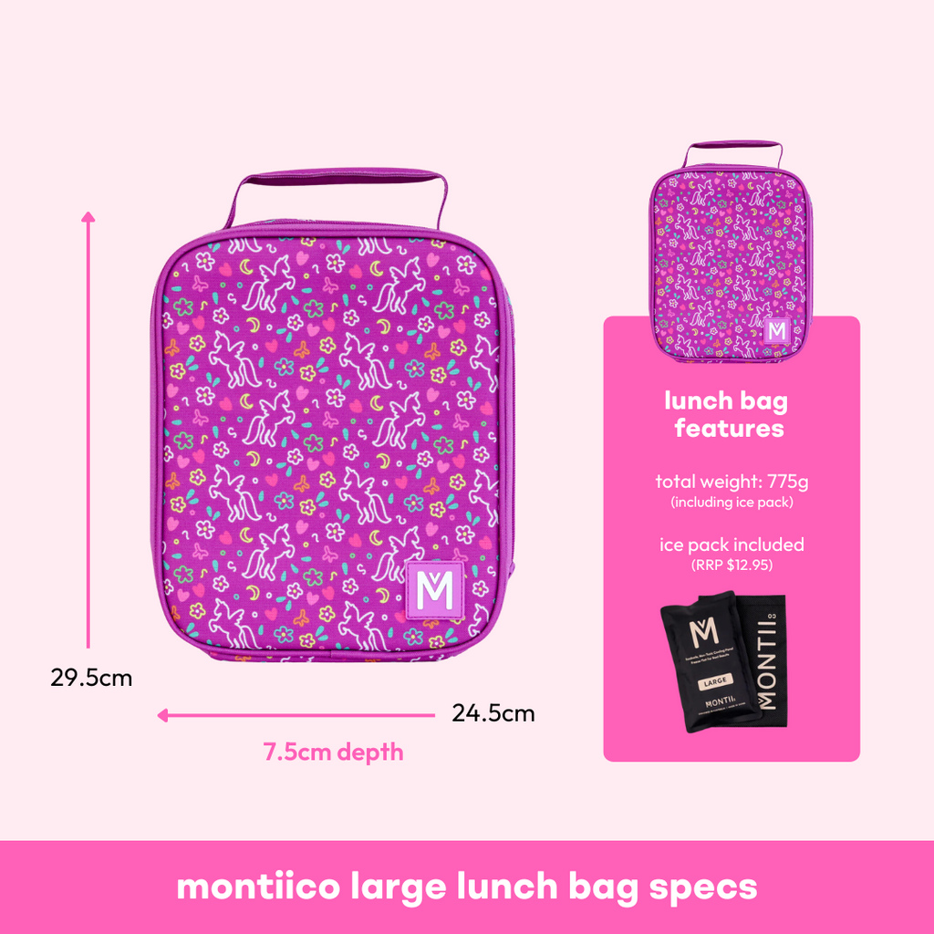 A large, machine washable, insulated lunch bag ready to keep school lunches cool and fresh. It fits a wide range of popular lunch and snack box combinations together inside (take a look at our Product Specs for exact brands & sizes), with MontiiCo's best-selling, highly rated Large Ice Pack included.